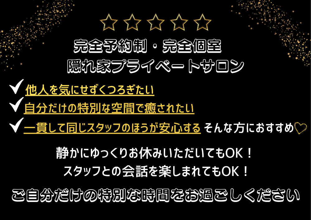 ・施術者が嫌がる行為、また施術を続けることが難しいと判断される場合には、即座に施術の中止及び退店していただきます。その際の返金は承っておりません。